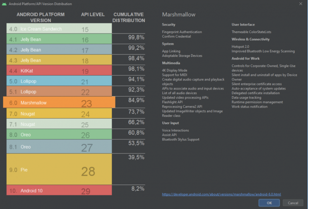 하지만 App Link는 Android API 6.0 버전 이상의 단말기에서만 사용 가능해요. (그 이전 버전의 단말기로는 App Link가 URL Scheme으로 적용됩니다.) 따라서 2020년 통계로 계산해보면전 세계의 16%의 앱은 App Link를 사용할 수 없다고 하네요.